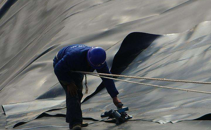 底部土工膜應(yīng)盡快與邊坡上土工膜連接上,防止下雨時(shí),雨水倒灌進(jìn)入土工膜焊接成品的下面。底部土工膜的鋪焊是在邊坡土工膜鋪焊完成之后進(jìn)行的。按裁好的土工膜尺寸,一幅一幅鋪設(shè),做好記錄。在鋪設(shè)土工膜時(shí),應(yīng)邊鋪邊焊,當(dāng)天鋪設(shè)當(dāng)天焊完。