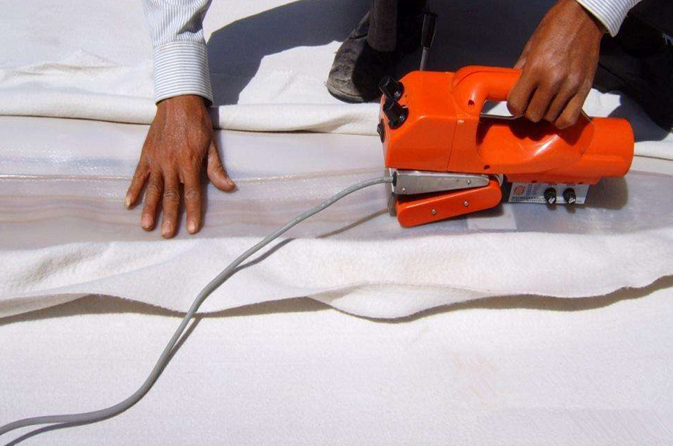在垃圾場(chǎng)邊坡鋪設(shè)土工膜時(shí),先把土工膜從事先確定好的位置平行于坡度線鋪設(shè),順次鋪設(shè)的土工膜,相鄰兩片土工膜搭接 100-120mm(根據(jù)所用焊接機(jī)不同,搭接寬度也會(huì)有差異,如:瑞士產(chǎn)的LEISTER6C型熱楔焊接機(jī)(小)搭接寬度為100mm,瑞士產(chǎn)的LEISTER ASTRO 熱楔焊接機(jī)(大)搭接寬度為120mm,美國(guó)產(chǎn)的WEDGEIT 2000型熱楔焊接機(jī)搭接為120mm,德國(guó)產(chǎn)的GEOWELD PLUS熱楔焊接機(jī)搭接為120mm。)