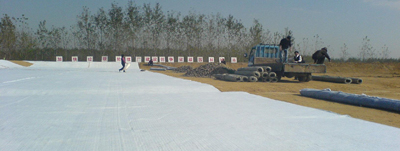 施工簡便:產品幅寬可達6米,長度最長可達40米,大大提高了施工效率。施工時只需將ST-GCL防水毯平鋪在地上。立面或斜面施工時,用釘子和墊圈將其固定,并按要求搭接即可;不受施工環境溫度的限制,0℃以下也可施工。